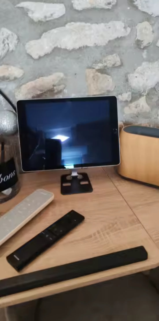 Oui, le support est réglable et peut pivoter à 360°, vous offrant l’angle de vue le plus confortable, que ce soit pour regarder des vidéos, suivre des appels ou travailler.